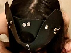 Asian chubby kitten toys with eggplants in wild solo play. Her curvy body and masked face add extra heat to the scene.