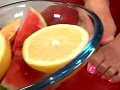 Brunette uses feet for footjob before doggy fucking