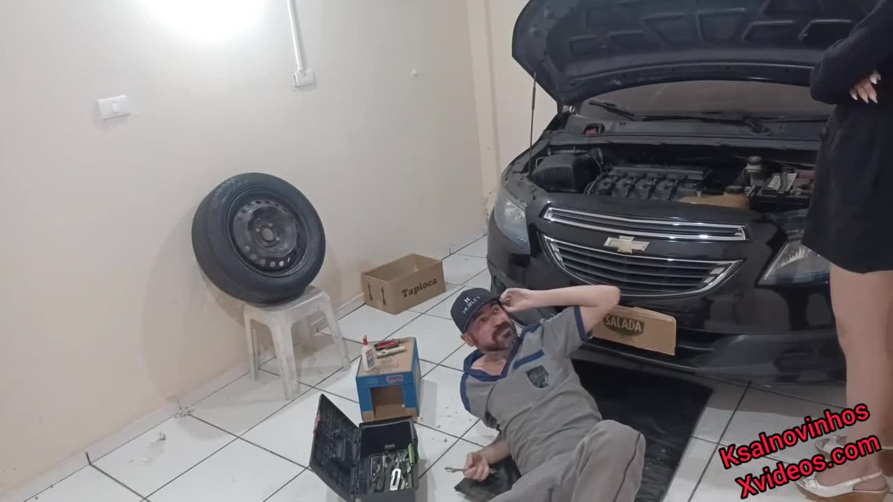 Patroa with tesao provokes mecanico to fuck right there in oficina with cum on ass dirty talk masturbation uniform voyeur action